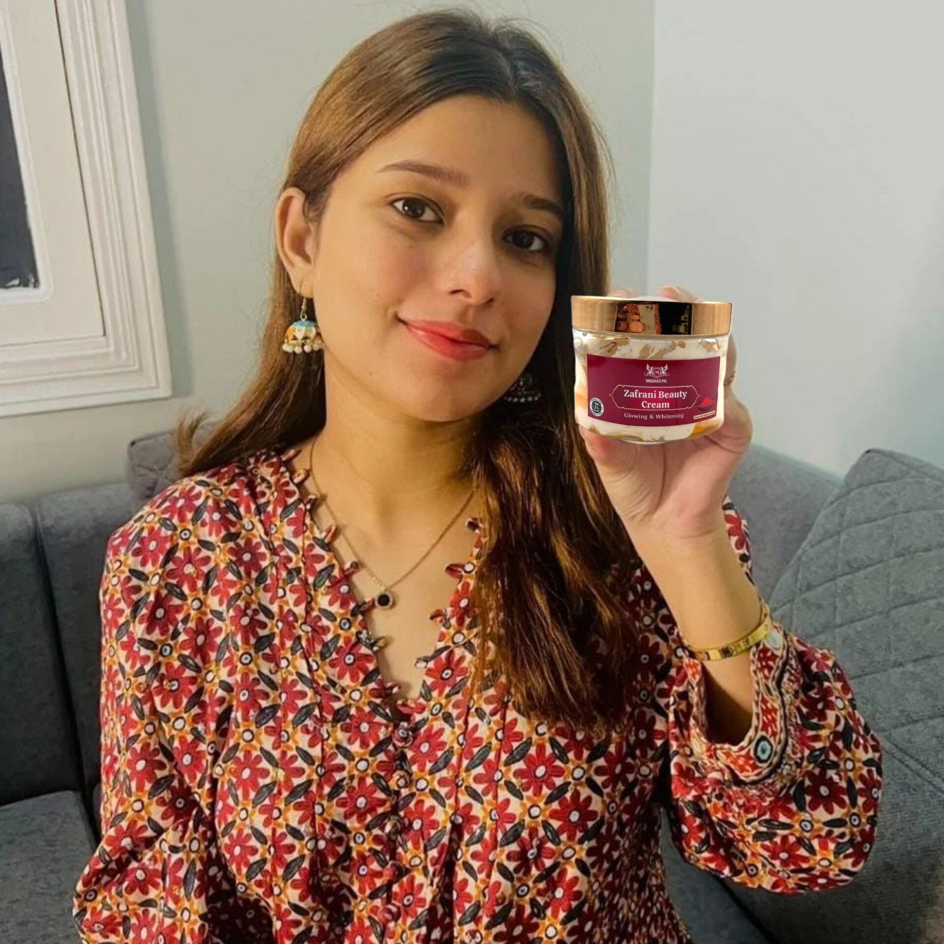 Thodi si Zafrani Beauty Cream le kar halka halka massage karein jab tak cream skin mein absorb na ho jaaye.